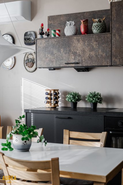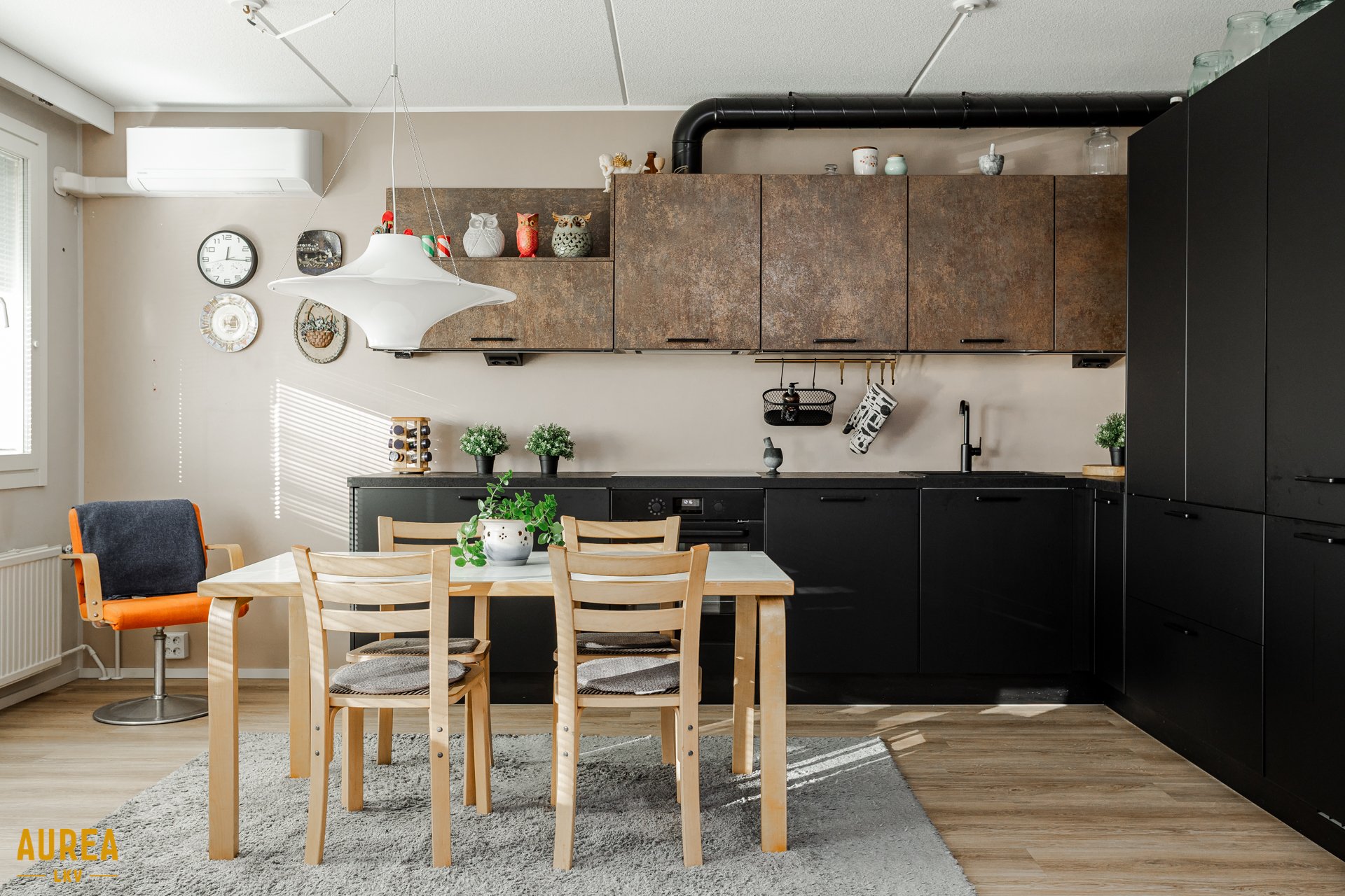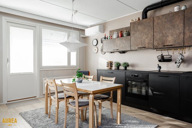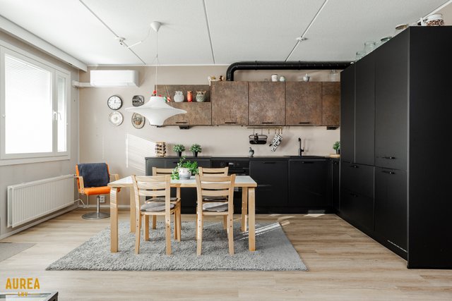 - Upea Noblessa keittiö remontoitu 2020, väliseinä poistettu, mattamustat alakaapistot ja ruskea/ruoste yläkaapistot. Integroidut kodinkoneet, aamiaiskaappi.