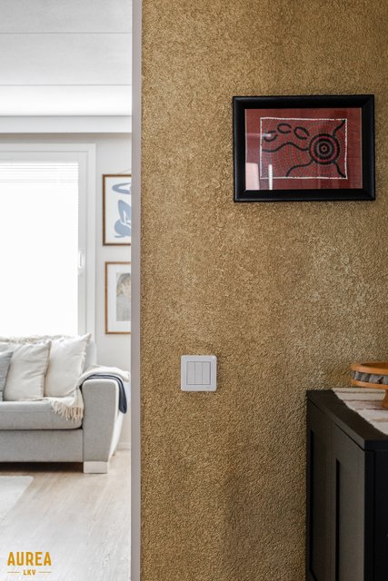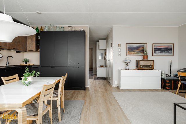 Olohuone ja keittiö ovat isoa yhtenäistä tilaa, josta remontin yhteydessä poistettu väliseinä. Olohuoneesta käynti parvekkeelle.