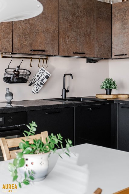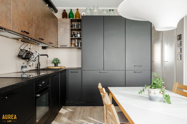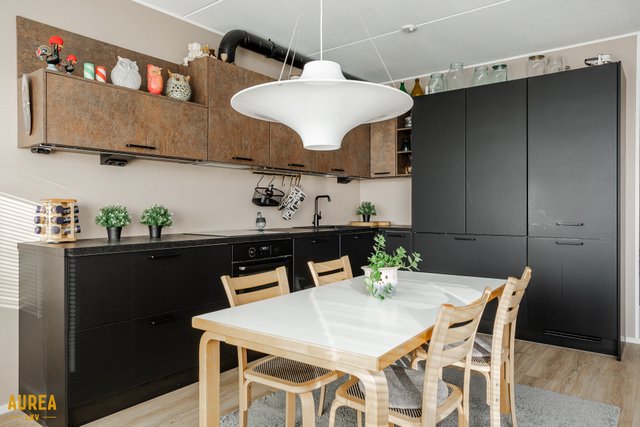 Koko huoneisto on täysin remontoitu tyylikkäästi laadukkaita materiaaleja ja kalusteita käyttäen 2020. Upea Noblessan keittiö, jossa on reilusti taso- ja säilytystilaa. Mattamustat alakaapistot ja ''ruosteen'' väriset yläkaapit tummien tasojen kanssa on todella tyylikäs kokonaisuus. Kaikki kodinkoneet ovat integroituja ja musta hana tummalla komposiitti altaalla kruunaa kokonaisuuden. Keittiöstä löytyy myös aamiaiskaappi johon saat kahvinkeittimet ja leivänpaahtimet mukavasti piiloon.