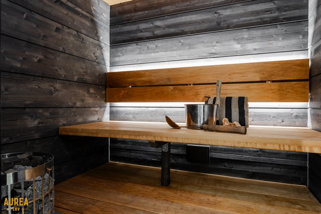 - Tunnelmallinen tumma sauna, lauteisiin upotettu pilarikiuas.