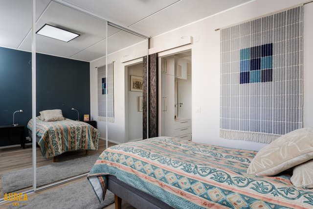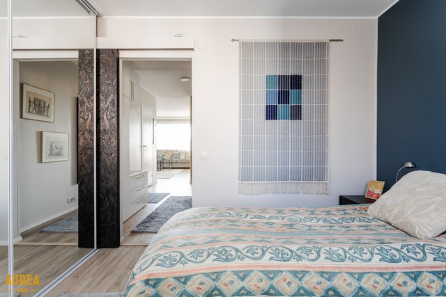 Makuuhuone on reilun kokoinen ja säilytystilana toimii kiintokaapisto. Etätyöntekijälle on kaapistojen peililiukuovien taakse upotettu työpiste. Lisäksi asunnossa on vaatehuone. Huoneistolle kuuluu häkkivarasto. Mahdollisuus autopistokepaikkaan.