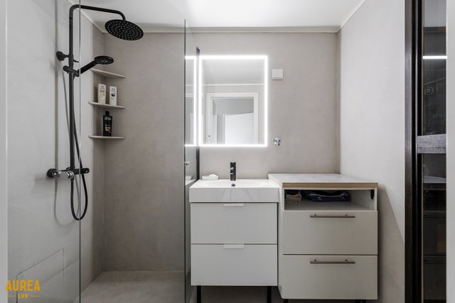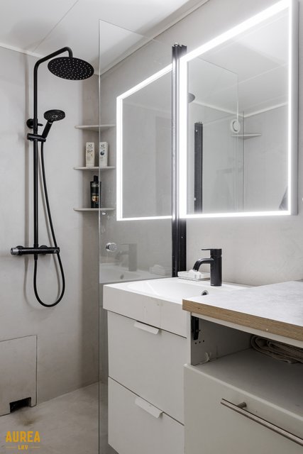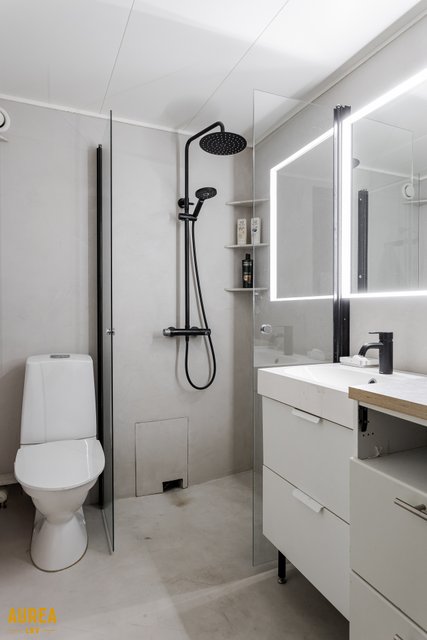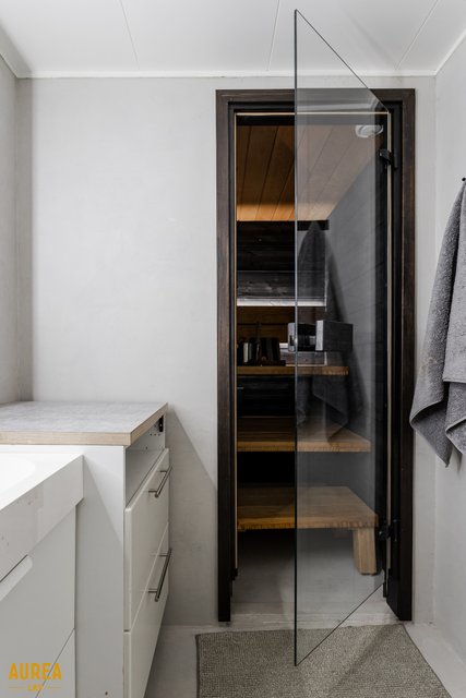 Kylpyhuone on pinnoitettu tyylikkäällä mikrosementti pinnoitteella. Kylpyhuoneen yksityiskohdat mukailevat myös keittiön värimaailmaa ja ovat mustia. Tunnelmallinen tumma sauna lauteiisiin upotetulla pilarikiukaalla on kuin piste iin päälle. Kylpyhuoneessa myös tilat ja liitännät pyykkikoneille.