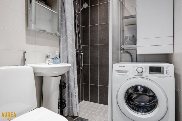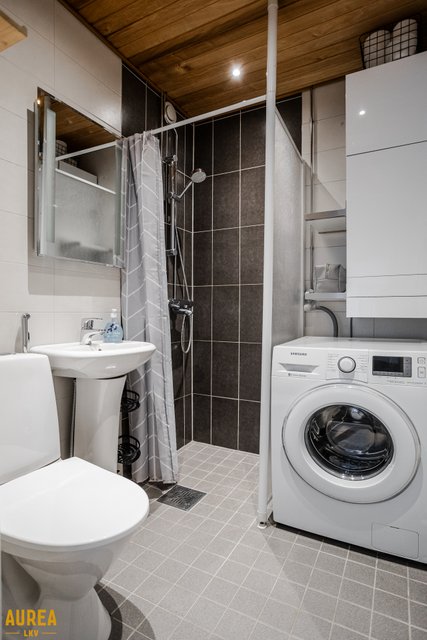 - WC-istuin, suihku, pesuallas, peili, pesukoneliitäntä, suihkuseinä, ja kaappi koneen päällä.
