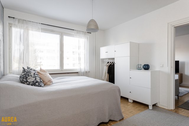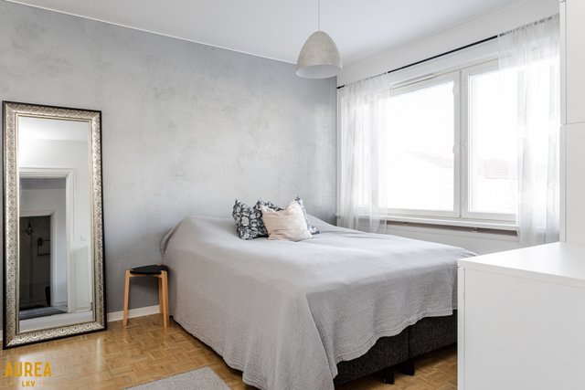 - Tammimosaiikkiparketti (hiottu ja lakattu 2009 sekä 2020). Samalla uusittu jalkalistat ja ovien peitelistoja. Tilava vaatehuone, jonne asennettu uudet hyllyt. Vaatehuoneessa tekstiilimatto sekä ikkuna. Vaatehuoneen patterin venttiilin tiiviste vuotanu 2018, kosteusmitattu ja lattiamateriaali vaihdettu. Jalkalistat sekä ovien peitelistoja.