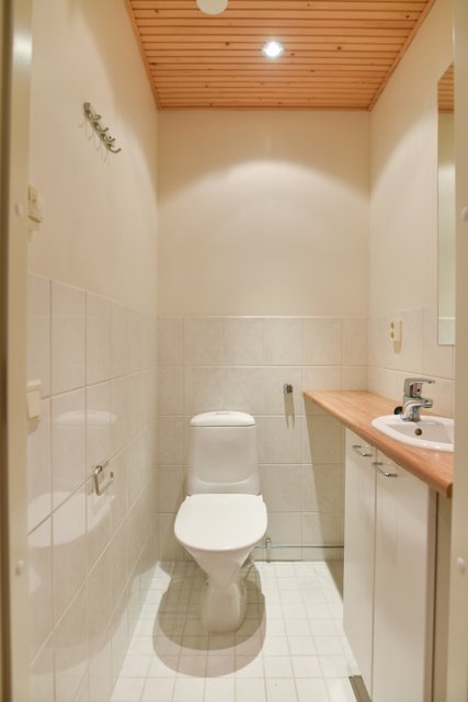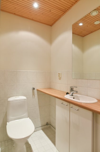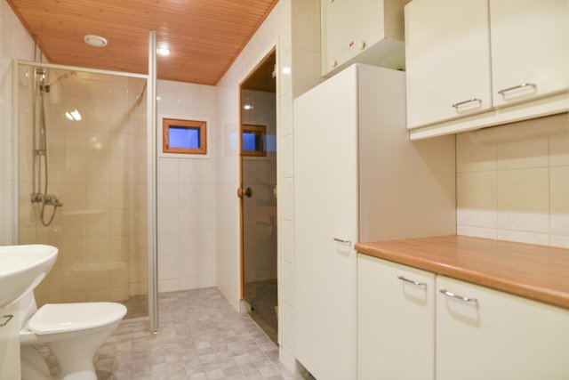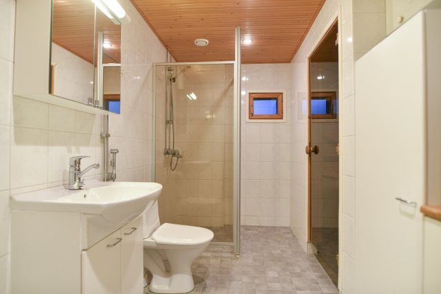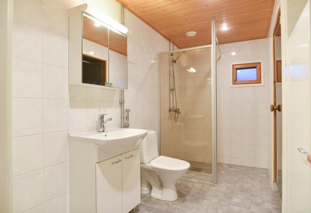 - Suihku, suihkuseinä, pesukoneliitäntä, lattialämmitys, peilikaappi, pesuallas, ja allaskaappi