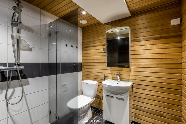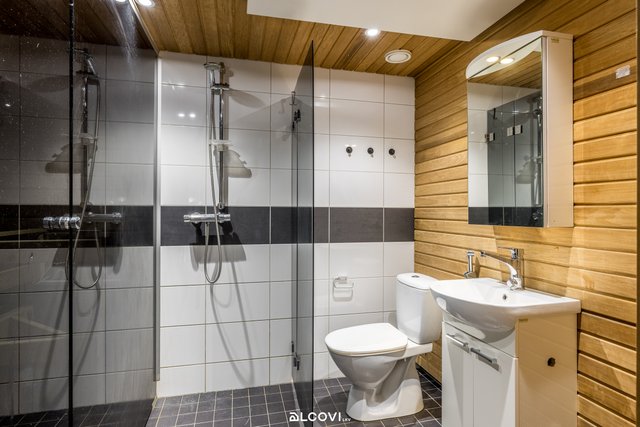 - Kylpyhuoneen varustukseen kuuluu allaskaappi, peilikaappi, tilavaraus pesutornille, pyykinpesukoneliitäntä, suihku, lasinen suihkuseinä, wc-istuin ja bidee-suihku ???. Lattia on laattaa, seinät osin kaakeloitu, osin paneloitu ja katto paneloitu. Spottivalaistus.