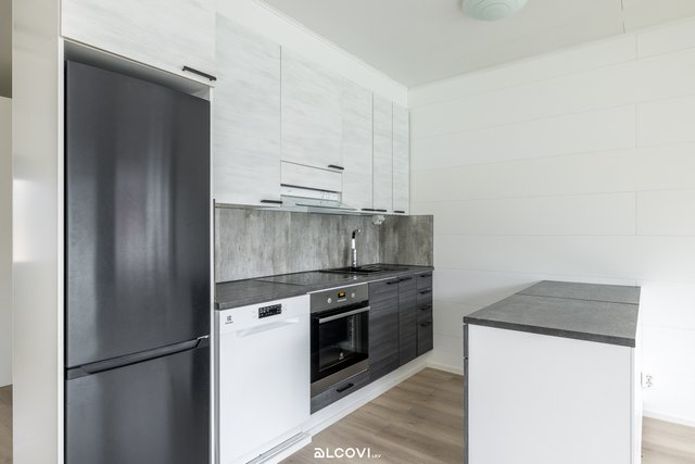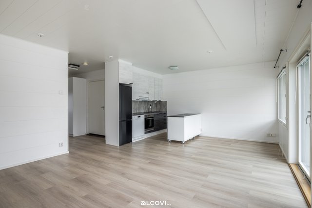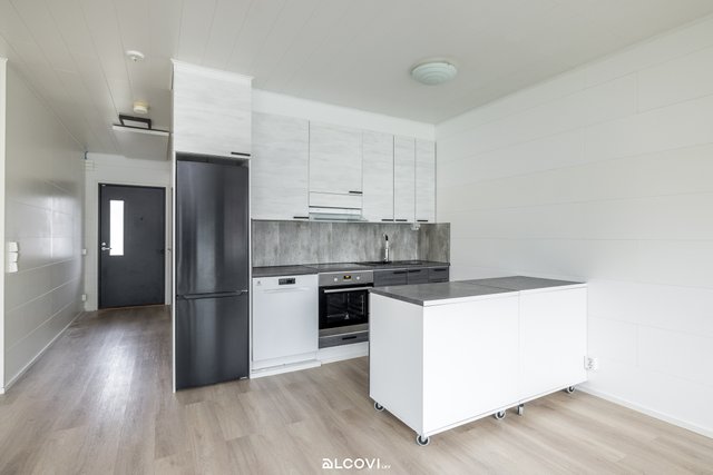 - Avokeittiön varustukseen kuuluu liesitaso, liesituuletin, kalusteuuni, astianpesukone, ja jääkaappi-pakastin. Lattia on laminaattia, seinät paneloitu. Siirrettävä saareke.
