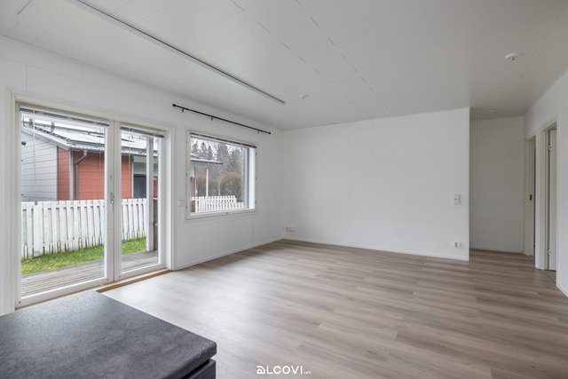 - Olohuoneen lattia on laminaattia, seinät paneloitu. Kulku terassille.