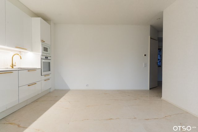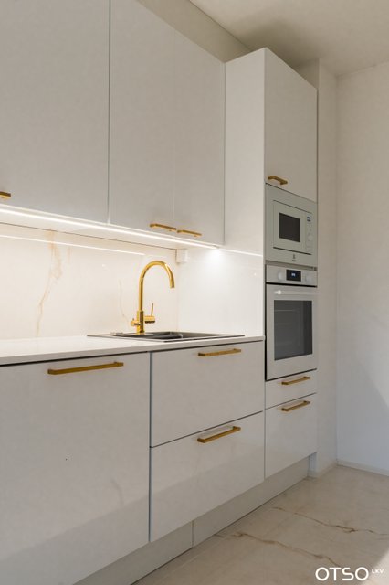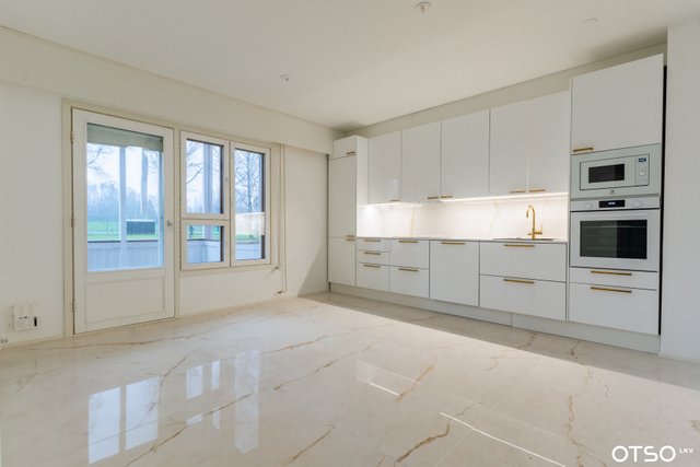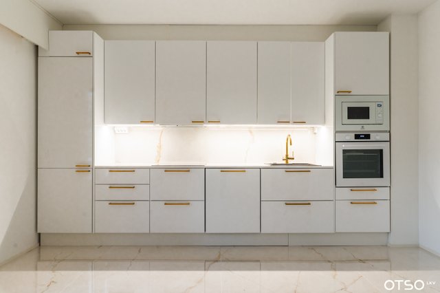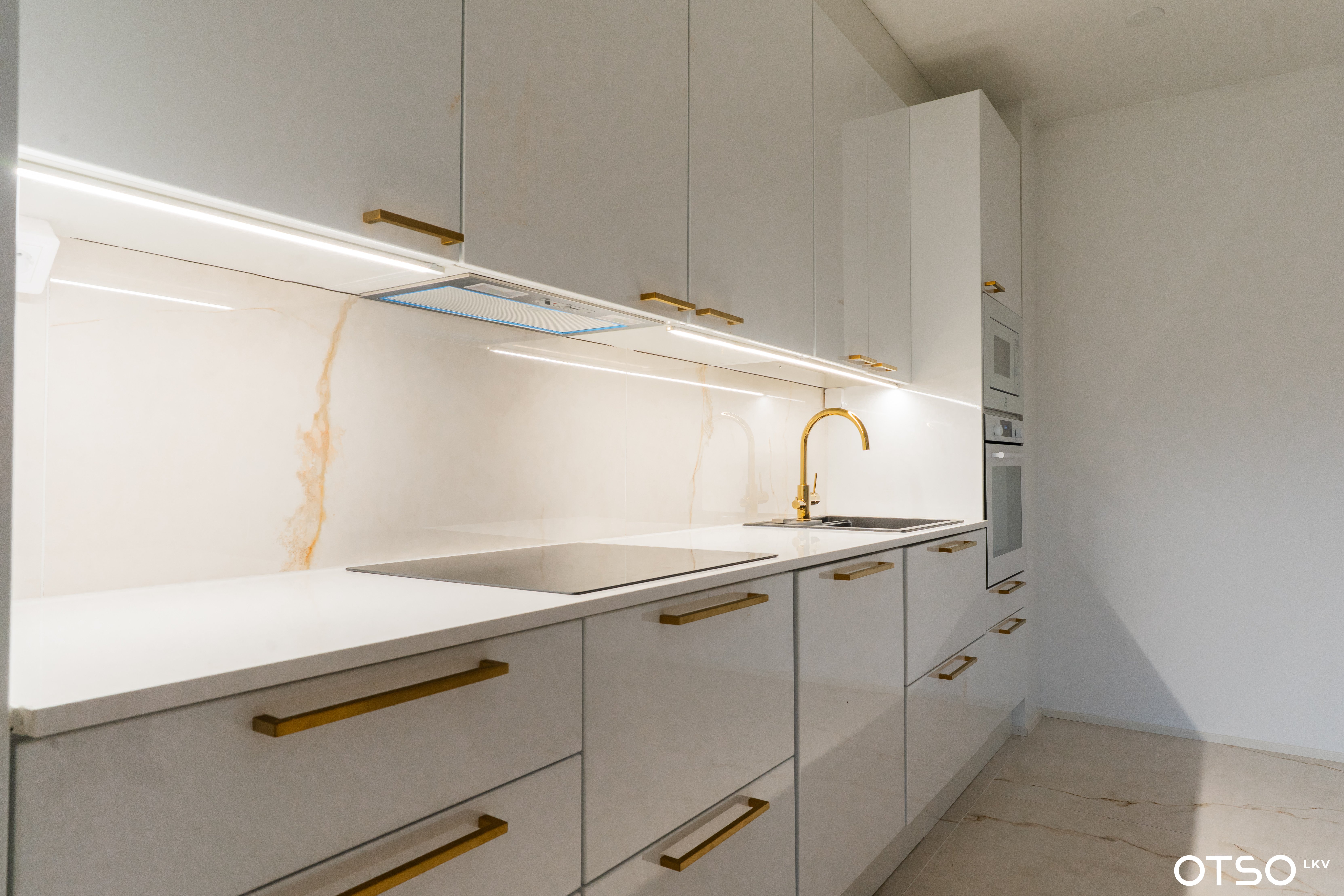 Asunnon moderni keittiö integroiduilla kodinkoneilla sulautuu tyylikkäästi kokonaisuuteen ja tarjoaa toimivat puitteet sujuvaan arkeen ja ruoanlaittoon.