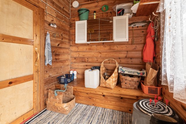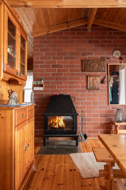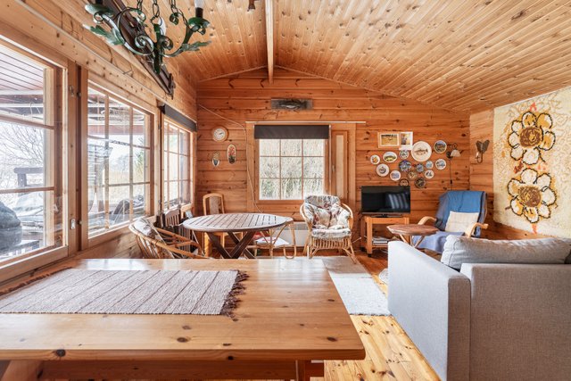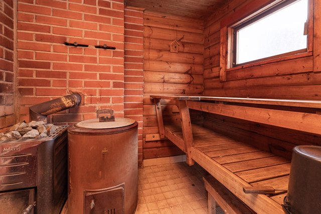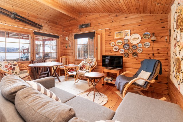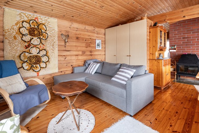 Sisätilat ovat kodikkaat ja toimivat. Olohuoneessa voi nauttia takkatulen lämmösä. Saunassa rentoutuminen puukiukaan lämmössä kruunaa päivän.