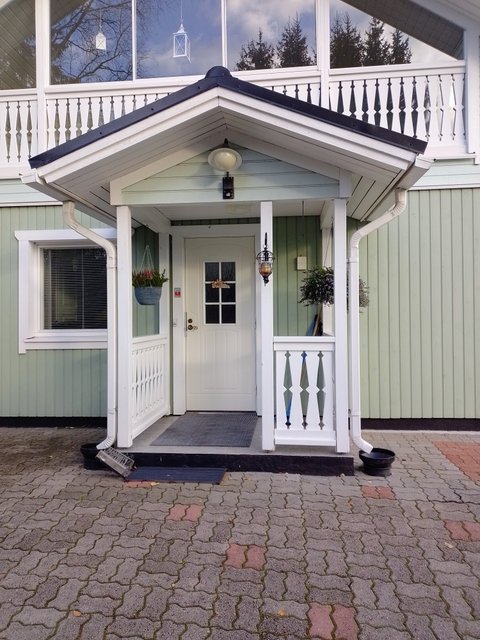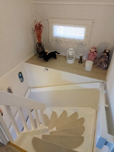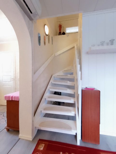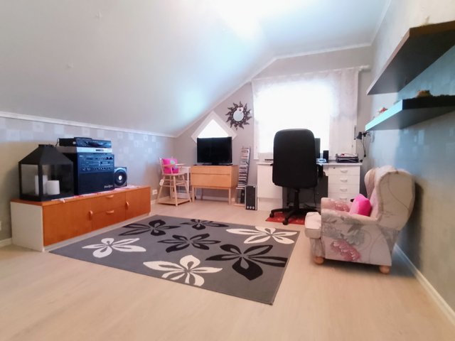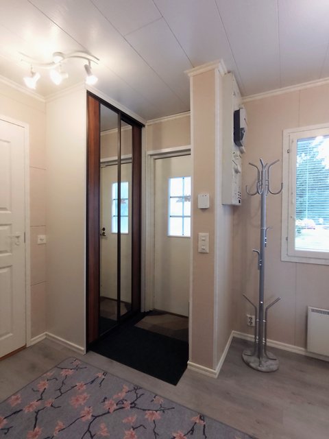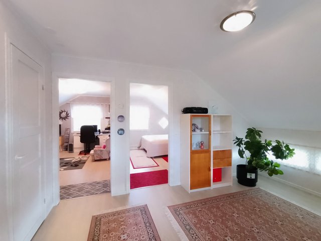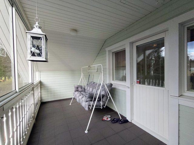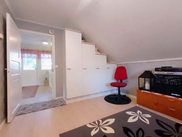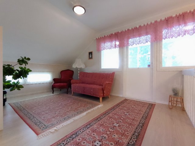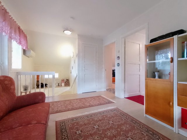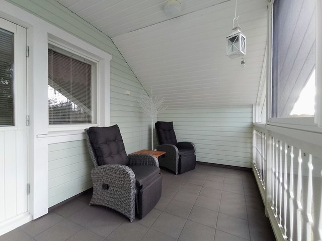 - Yläkerrassa aulatila 12 m2 ja lasitettu parveke 11 m2 (lattia laatoitettu). Varasto /teknisessä tilassa pesukoneliitäntä, lämminvesiboileri, vedensulkuhanat.