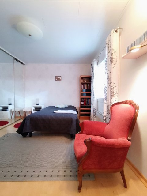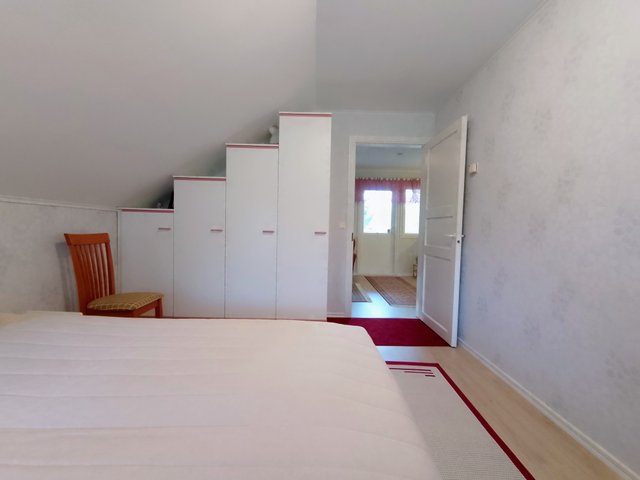 - Alakerran makuuhuoneessa seinän levyinen liukuovikaapisto. Yläkerran makuuhuoneissa vinokattoon suunnitellut kaapit.