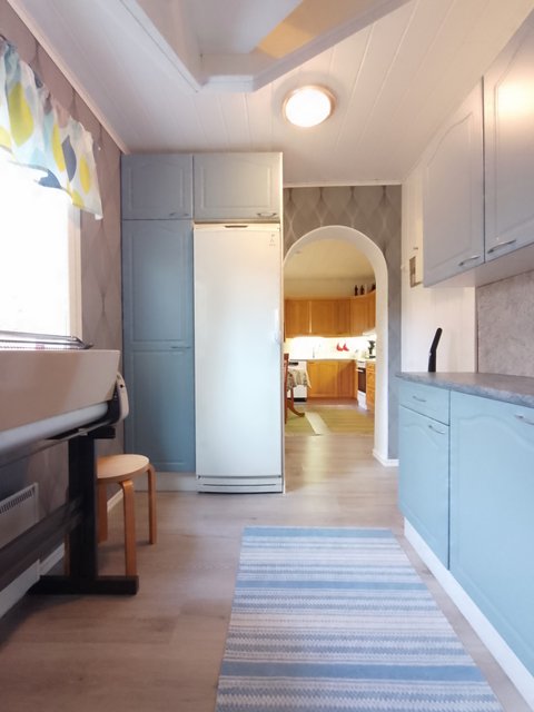 - Pakastin ja kuivausrumpu kodinhoitohuoneessa. Kaapistot ja työskentelytaso.