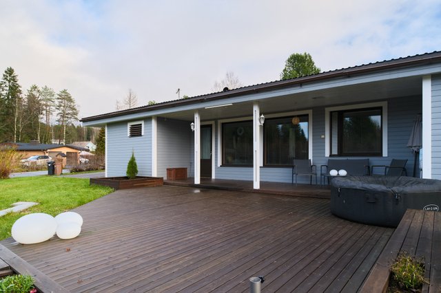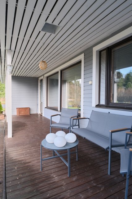 - Osa terassista on sisäänvedetty ja näin ollen katettua tilaa ja tämän tilan jatkeena on puinen patio. Patiolla on hyvin tilaa kalusteille.