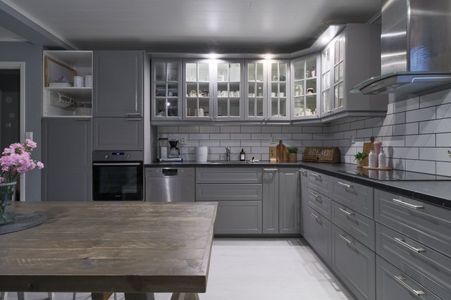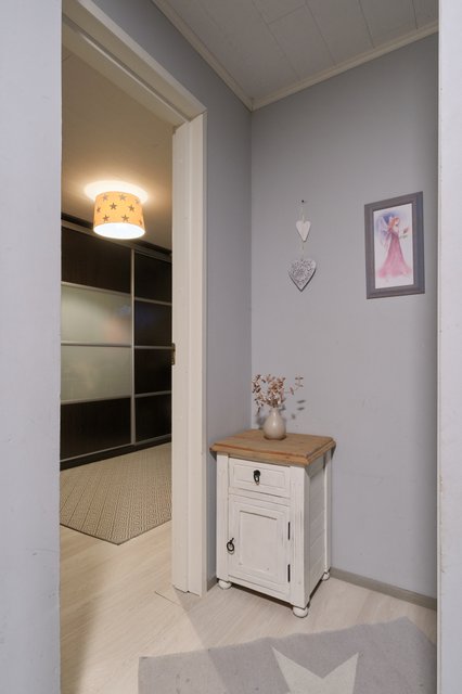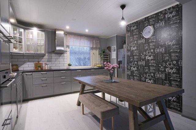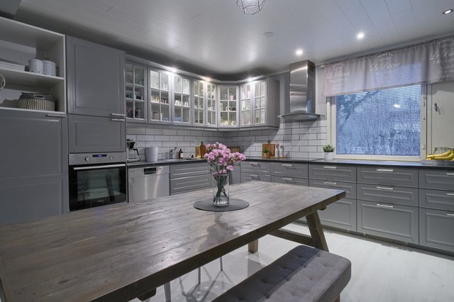 - Joka keittiön haltijan unelma: runsaasti säilytys- ja työskentelytilaa. Keittiö on remontoitu 2018, jolloin mm. kaapistot (Ikea-keittiön mallistoa) ja osa kodinkoneista on uusittu. Keittiöön ilmettä antaa lasiovelliset yläkaapoistot, joissa on kohdevalot. Tarvittaessa isokin ruokapöytä mahtuu hyvin.