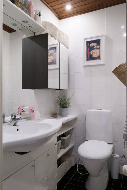 - Suihku, wc-istuin, peilikaappi, allaskaappi, lattialämmitys, bidee-suihku, suihkuseinä, ja pesukoneliitäntä