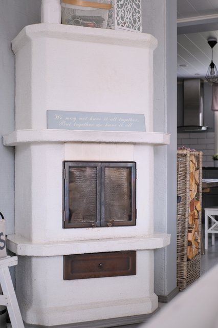- Avara olohuone, jossa varaava takka. Käynti ulos takapihan terassille.