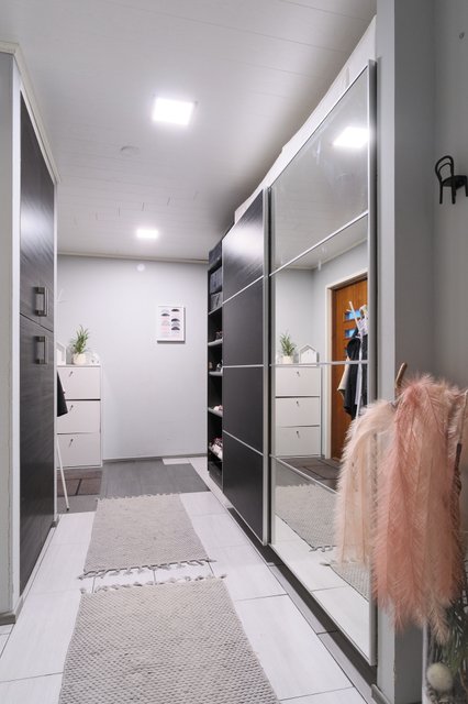 - TYÖHUONE: Työhuone, joka vuonna 2017 on muutettu osasta autotallia huoneeksi. Huoneessa koko seinän leveydeltä kaapistoja. Yläikkunat. Lattiassa laminaatti, seinät maalattu, osittain tapetoitu ETEINEN: Eteisessä liukuovellinen kaapisto, jossa vaatesäilytys hyvin katseilta piilossa. Lattialämmitys. Lattia laatta, seinä maalattu.
