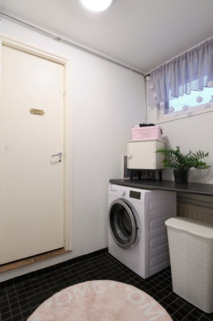 - Eteisestä käynti erilliseen kodinhoitohuoneeseen, jossa on pyykkihuolto on näppärä hoitaa. Pöytätilaa mm. pyykinkäsittelyyn. Ikkunan kautta tulee luonnonvalo tilaan. Tilasta käynti tekniseen tilaan, jota kautta pääsee ulos.