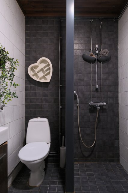 - Kylpyhuone on kauttaaltaan laatoitettu. Toinen wc-istuin tässä tilassa. Kiinteä, kaakeloitu suihkuseinä erottaa suihkutilan wc-tilasta.
