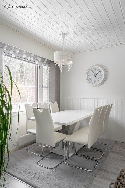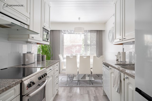 Keittiön yhteydessä ruokatila johon mahtuu isompikin ruokapöytä. Vaaleassa keittiössä tyylikkäät kivitasot. Keittiön koneita sekä allashana uusittu v 2025.