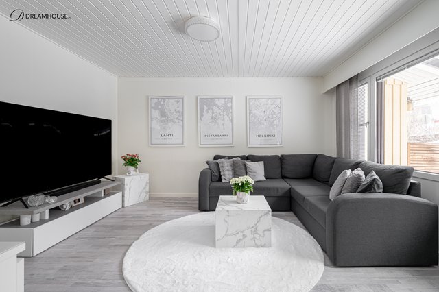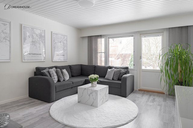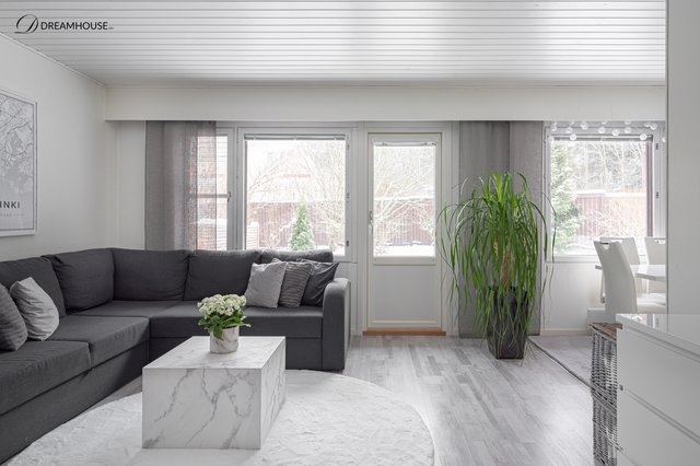 Avara olohuone josta käynti isolle ja suojaisalle takapihalle joka kiertää asunnon sivulle. Pihalla erittäin iso terassialue jossa vietätkin mukavasti aurinkoisia kesäpäiviä.