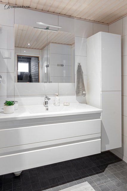 - Suihku, wc-istuin, suihkuseinä, pesukoneliitäntä, lattialämmitys, peilikaappi, pesuallas, allaskaappi, ja kaappi