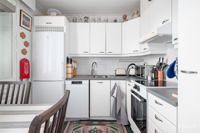 - Jääkaappipakastin (Uusittu v. 2025), astianpesukone (Uusittu v. 2022), uuni, ja liesi (Induktio, uusittu v. 2021)