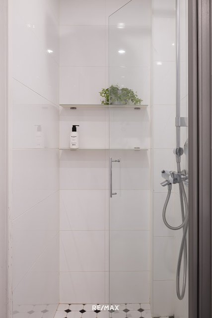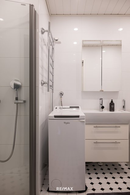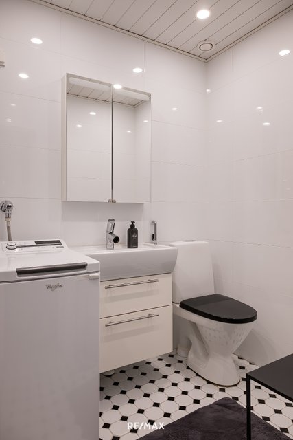 - WC-istuin, suihku, suihkuseinä, pesukoneliitäntä, lattialämmitys, peilikaappi, pesuallas, allaskaappi, ja bidee-suihku