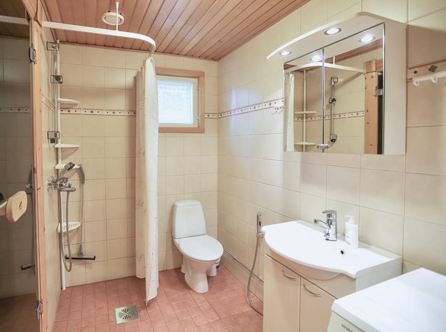 - Pesukone, peilikaappi, allaskaappi, bidee-suihku, wc-istuin, suihku, lattialämmitys, ja pesuallas