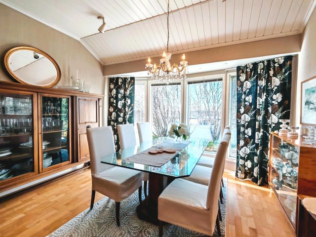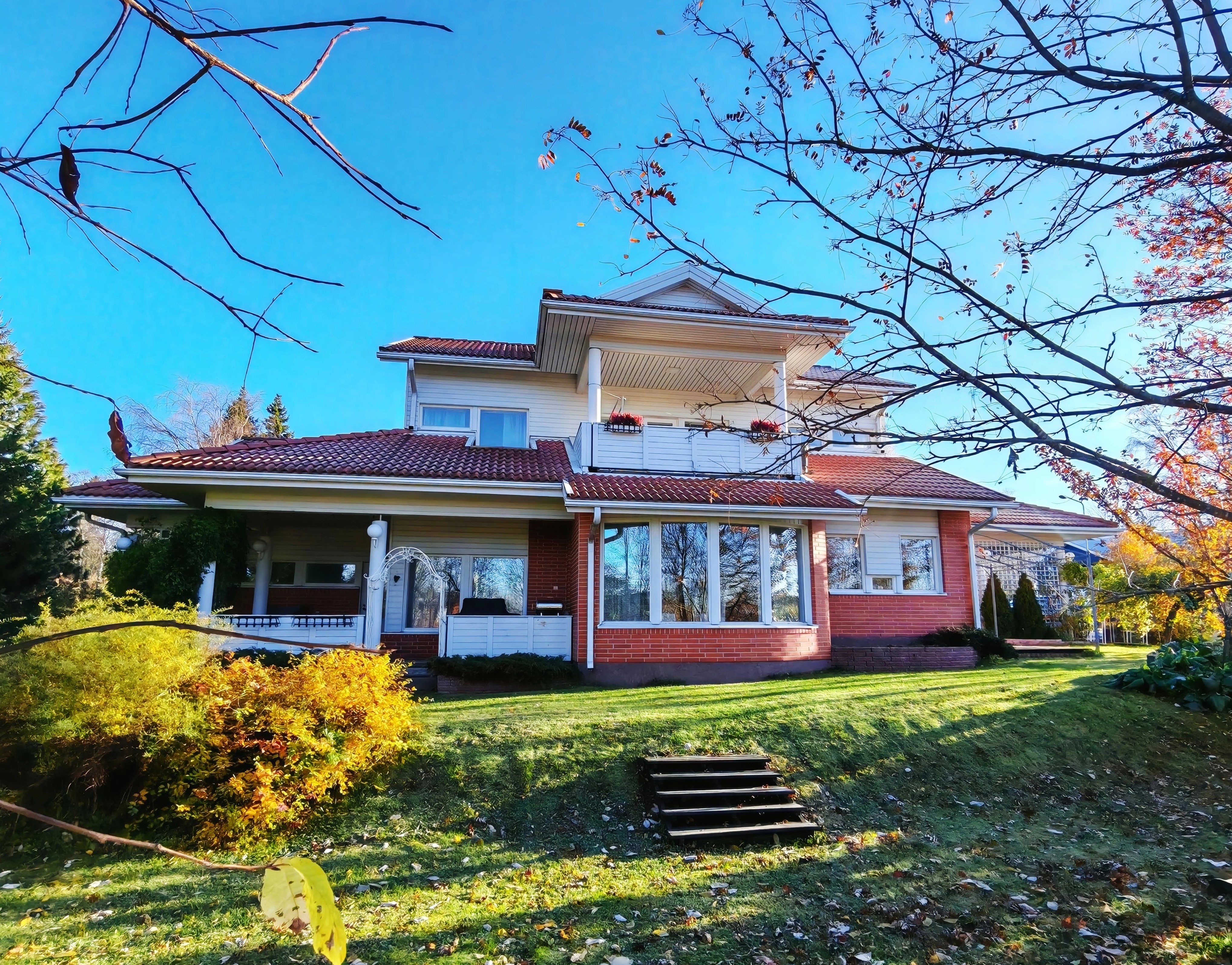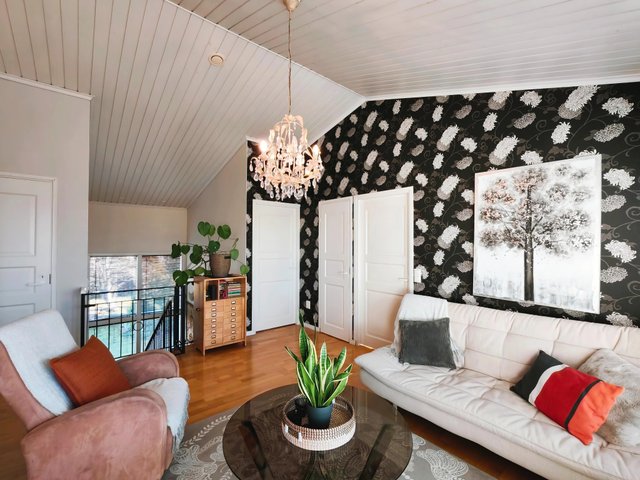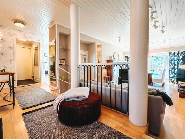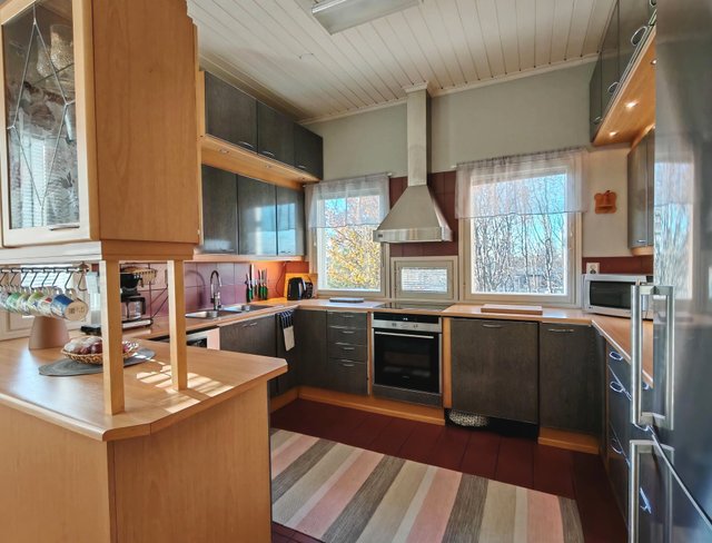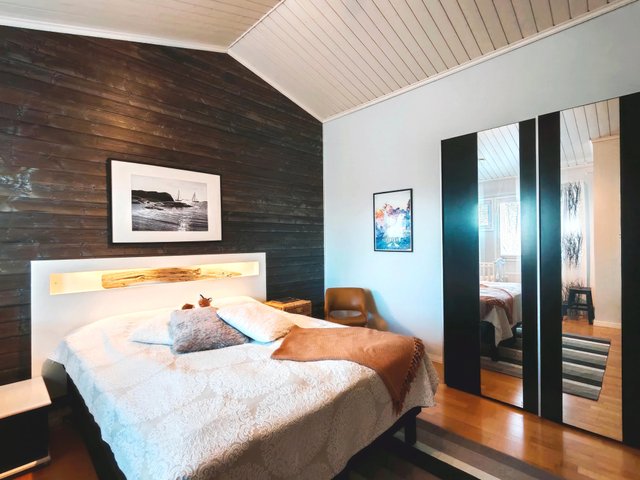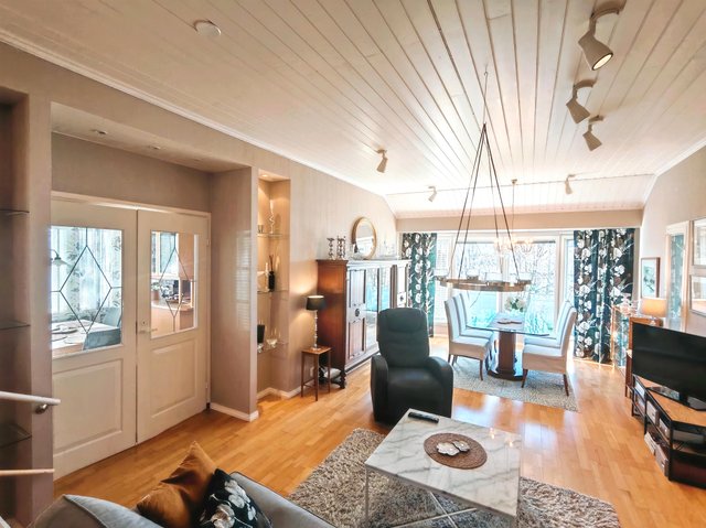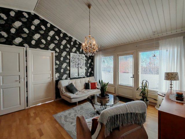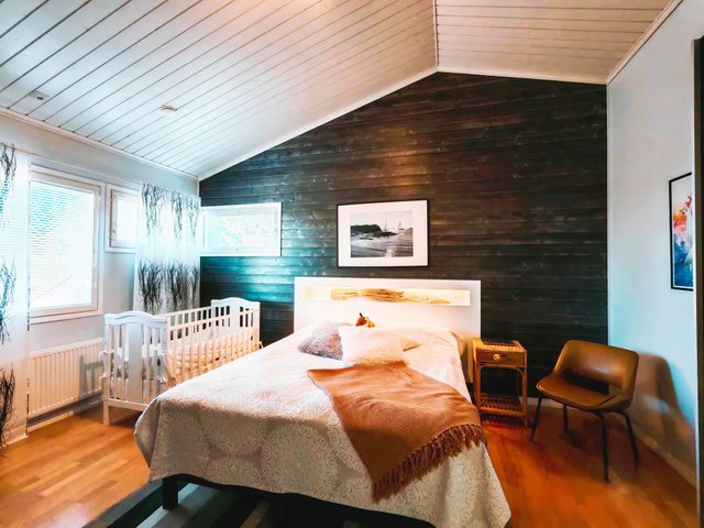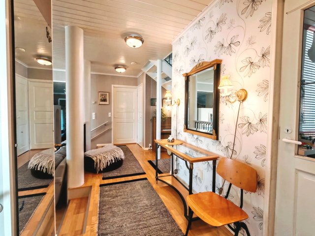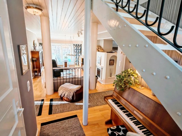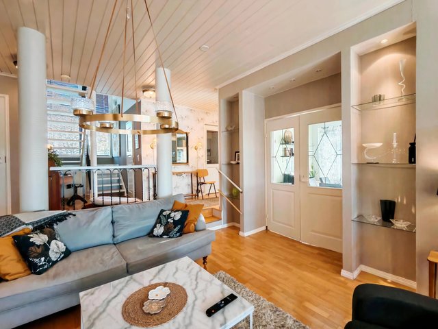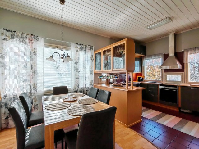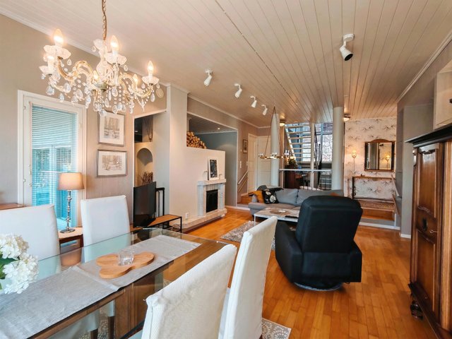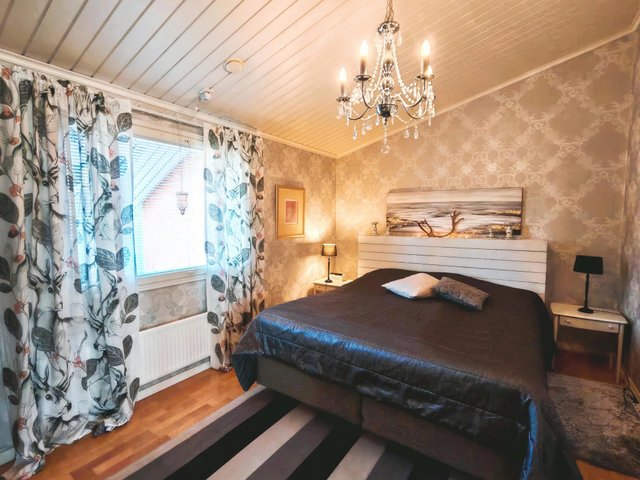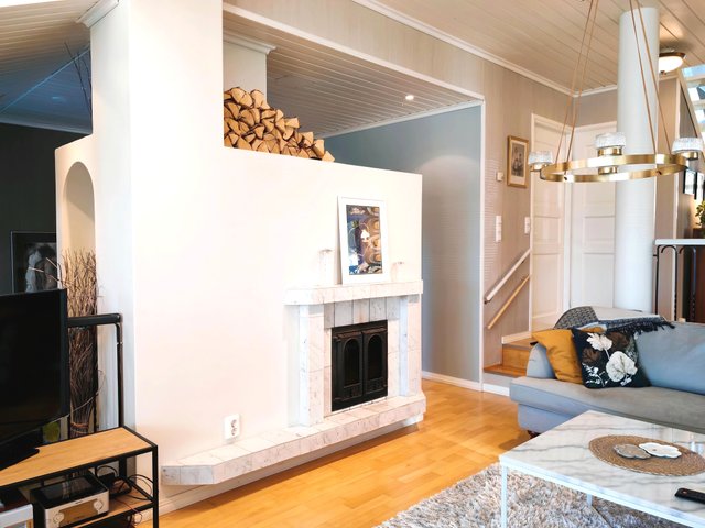 Korotettu sisäkatto antaa tilantuntua ja lämpimät sävyt luovat taloon kodikkaan tunnelman. Keittiö on ajaton ja toiminnallinen, ja sen yhteydessä on ruokailutila. Olohuoneen isot ikkunat päästävät valon ihanasti sisään ja makuuhuoneita on kaikkiaan neljä. Erillisen kodinhoitotilan yhteydessä on pukuhuone ja tilavassa kylpyhuoneessa tuplasuihkut. Tunnelmallinen tumma sauna ja takkahuoneessa ihana, varaava läpitakka olohuoneen puolelle.
