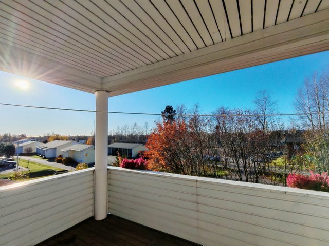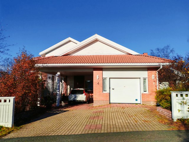 Talo seisoo tukevasti suojaisalla ja valoisalla kulmatontilla, jossa päivän viimeisistä auringonsäteistä voi nauttia vaikkapa yläkerran parvekkeella. Sisäänkäynnin yhteydessä on autokatos ja autotalli sekä kaksi lämmintä varastoa. Oman rinnemäisen tontin lähistöllä mm. jäähalli, hiihtoladut, urheilu- ja golfkenttä sekä kauppa, koulut ja päiväkoti, sijainti on siis mitä mainioin! Pihassa grillikota, leikkimökki sekä patio sekä runsaasti istutuksia.