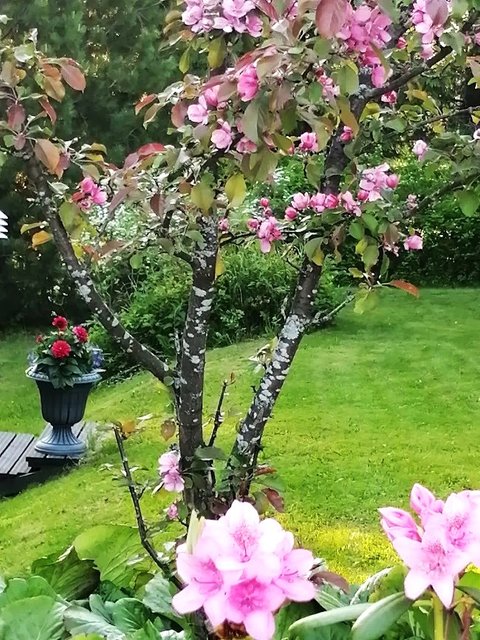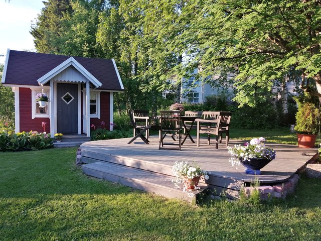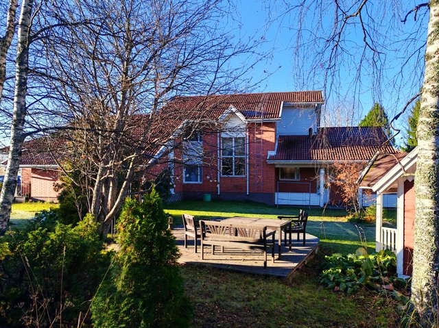 - Aurinkoinen rinnetontti, etupiha länteen. Suojaisa, istutuksia (mm. omenapuita, marjapensaita). Aidattu, piha rinnemäinen ja länsiosaltaan kahdessa tasossa.