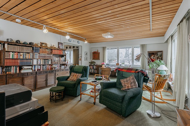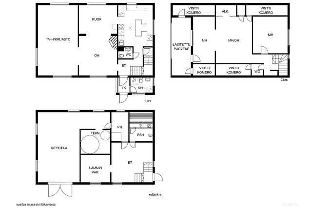 - Kirjasto/tv-huoneessa kokolattiamatto, seinät maalattu ja katossa puupaneeli. Todella ison Kirjasto/tv-huoneen pystyisi tarvittaessa jakamaan kahdeksi eri huoneeksi. Eteisessä kokolattiamatto, seinillä sormipaneelin tapainen puupaneeli ja katossa Halltex-levyä. Iso lämmin kellari/työtila omalla sisäänkäynnillä sekä lämmin varastohuone.