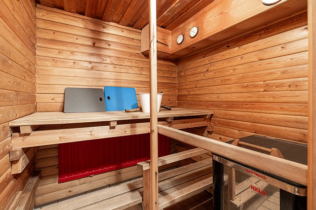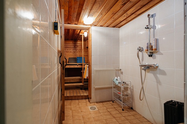 - Tilava sauna kellarissa. Katossa puupaneeli.