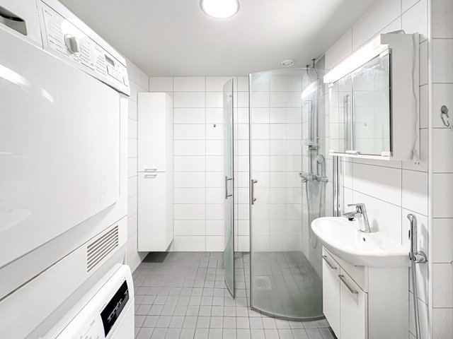 - WC-istuin, suihku, suihkuseinä, pesukoneliitäntä, bidee-suihku, allaskaappi, peilikaappi, lattialämmitys (Vesikiertoinen), ja pesuallas