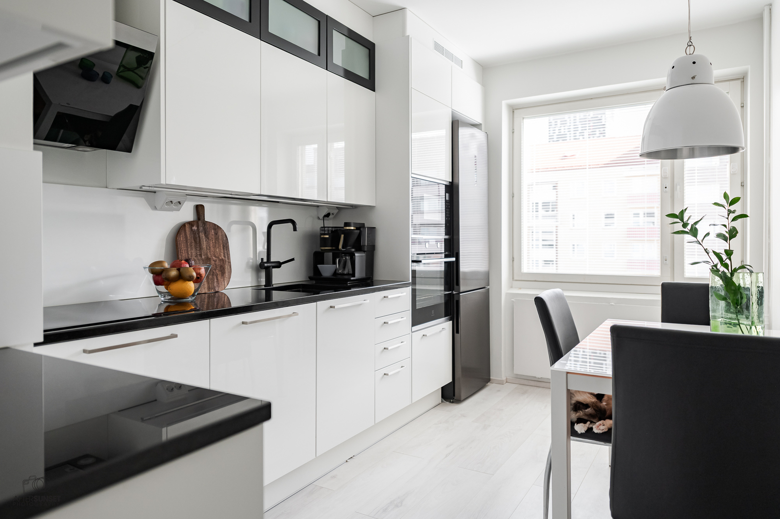 - Varustus: Jääkaappipakastin, erillisuuni, liesitaso (induktio), liesituuletin, mikro (integroitu), astianpesukone (integroitu), kiinteät kalusteet ja kiinteät valaisimet. Materiaalit: Työtaso Kivi, lattiapinnat laminaattia ja seinäpinnat maalattu.