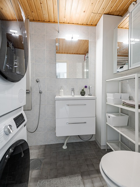 - Varustus: Suihku, allaskaappi, peilikaappi, WC-istuin, pesukoneliitäntä. Materiaalit: Lattia- ja seinäpinnat laatoitettu