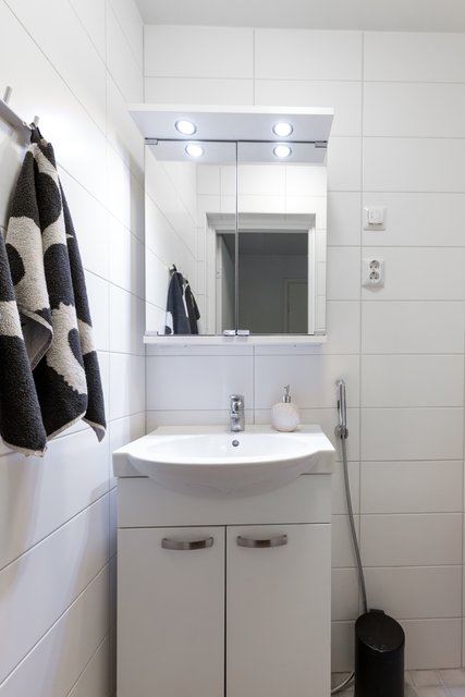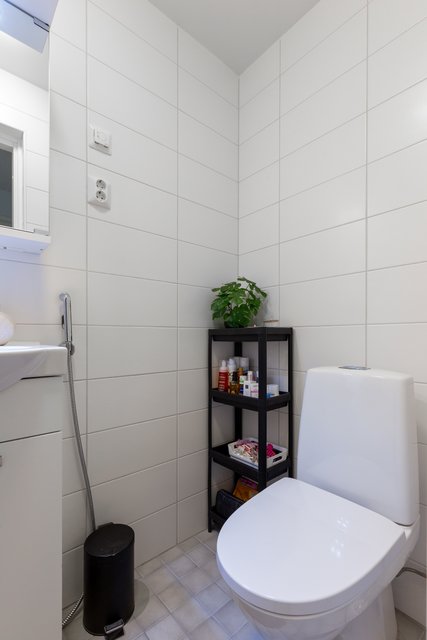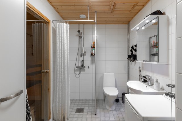- Suihku, lattialämmitys, pesukoneliitäntä, suihkuseinä, wc-istuin, peilikaappi, ja allaskaappi