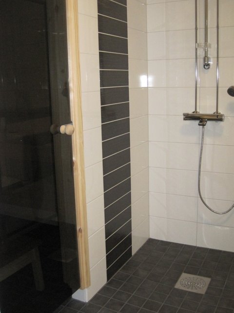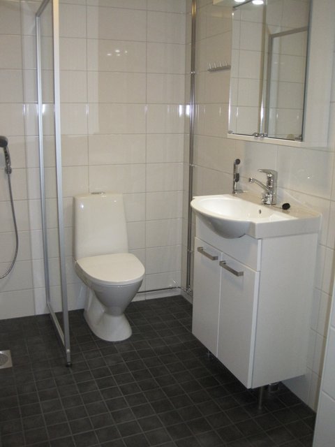 - WC-istuin, suihku, suihkuseinä, lattialämmitys, pesukoneliitäntä, peilikaappi, ja allaskaappi