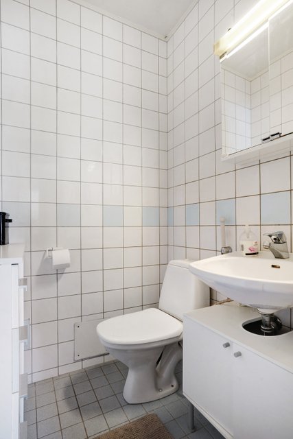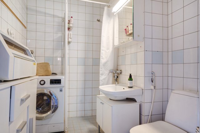 - WC-istuin, suihkuseinä, pesukoneliitäntä, peilikaappi, bidee-suihku, ja pesuallas