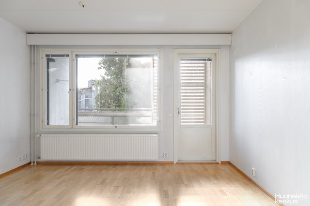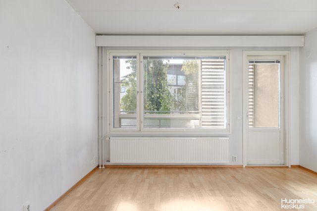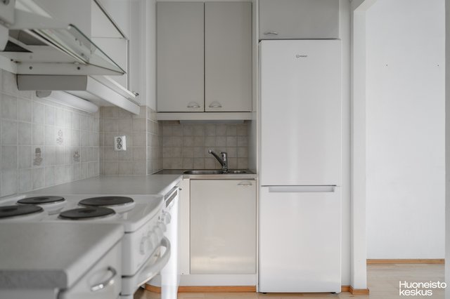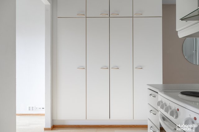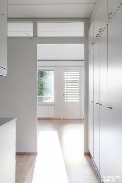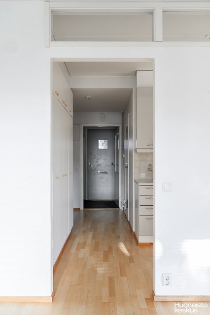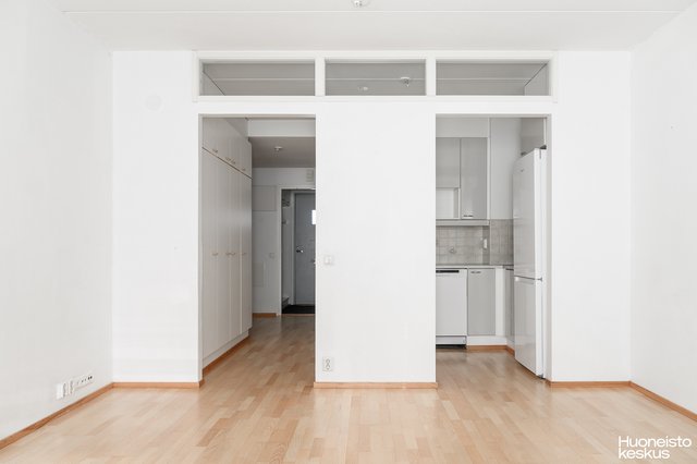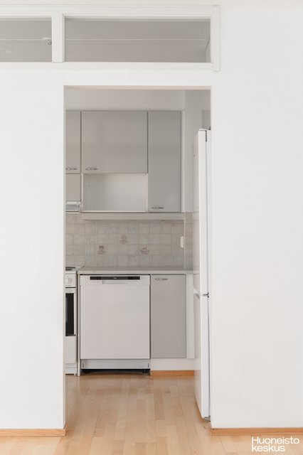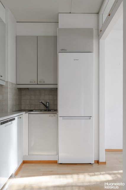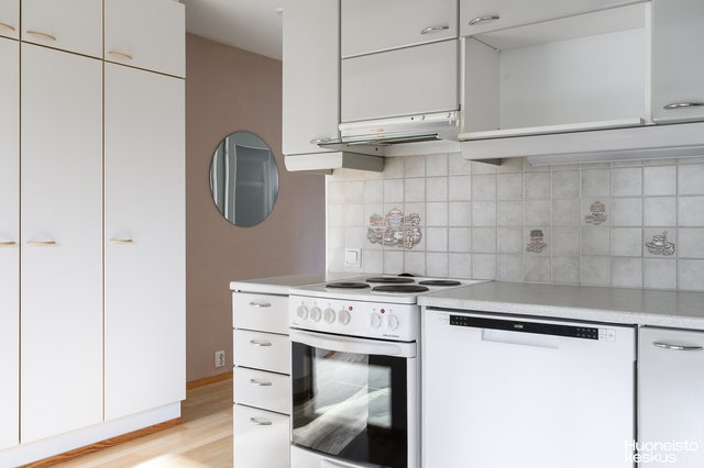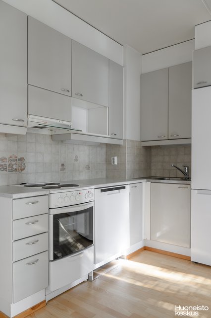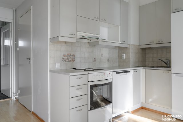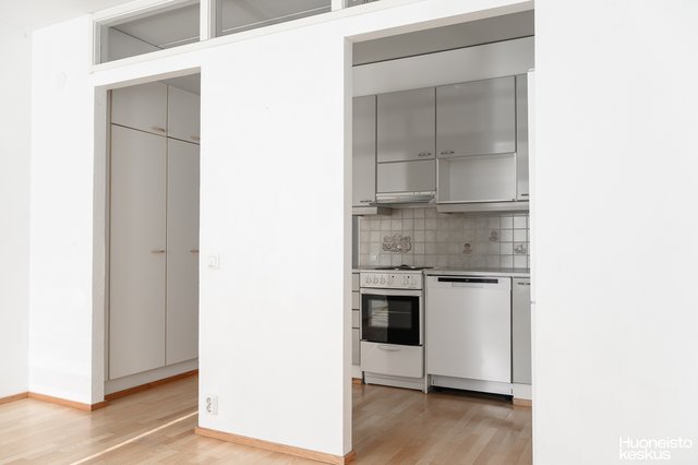 Sisään tulviva valo toistuu kauniisti vaaleista seinistä ja parketista. Kompaktissa keittiössä on kaikki toimivan arjen avaimet täysikokoisesta uunista astianpesukoneeseen sekä hyvään määrään laskutilaa.