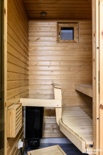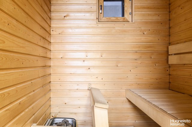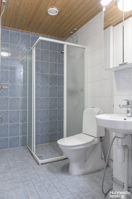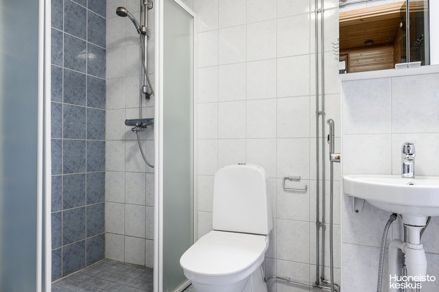- WC-istuin, suihku, suihkuseinä, pesukoneliitäntä, peilikaappi, pesuallas, ja bidee-suihku