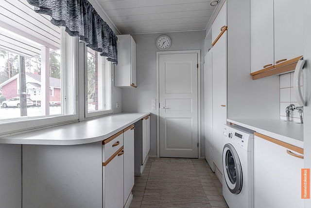 - Pesuallas, lattialämmitys, pesukoneliitäntä, lattiakaivo, pyykkikaapit, ja pöytätaso