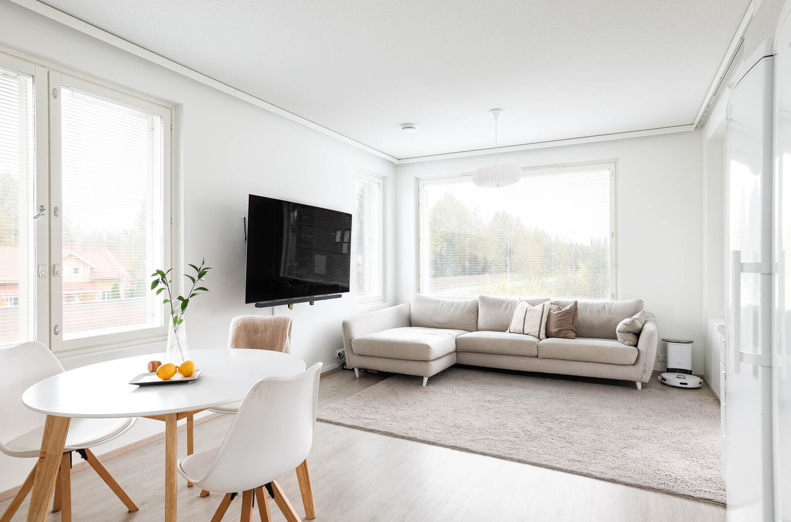 Kodin valoisa avokeittiö ja olohuone ovat yhtenäistä tilaa ja käynti lasitetulle parvekkeelle on olohuoneesta. Parvekkeella käyttömukavuutta ja yksityisyyttä lisää laseihin asennetut kaihtimet.