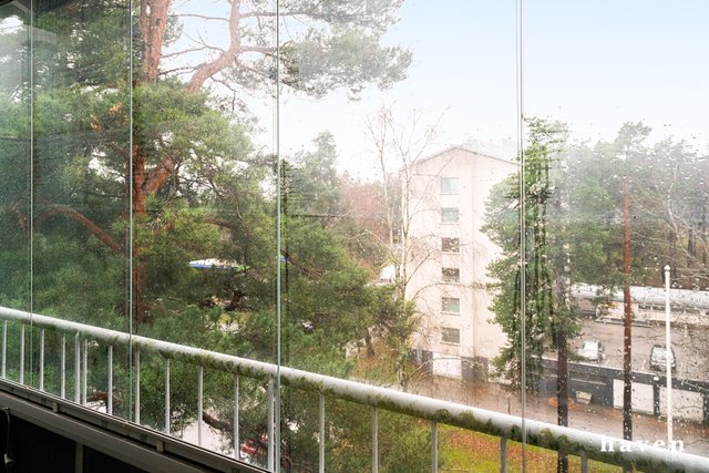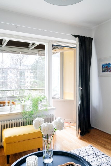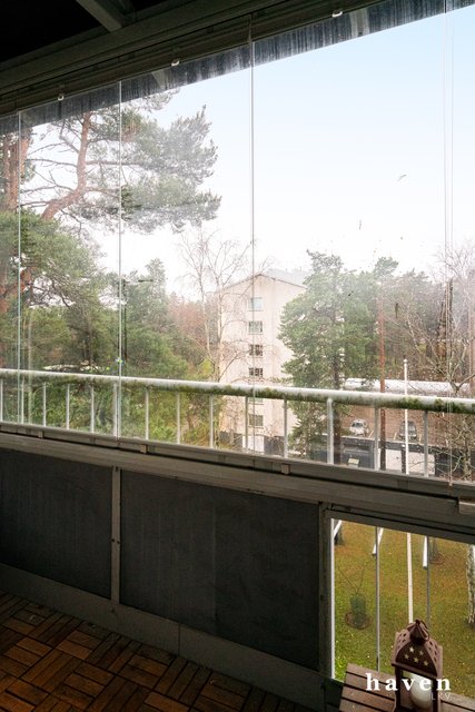 - Tilavasta olohuoneesta käynti lasitetulle parvekkeelle ja näkymät rauhalliselle pihalle.