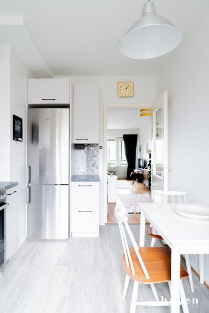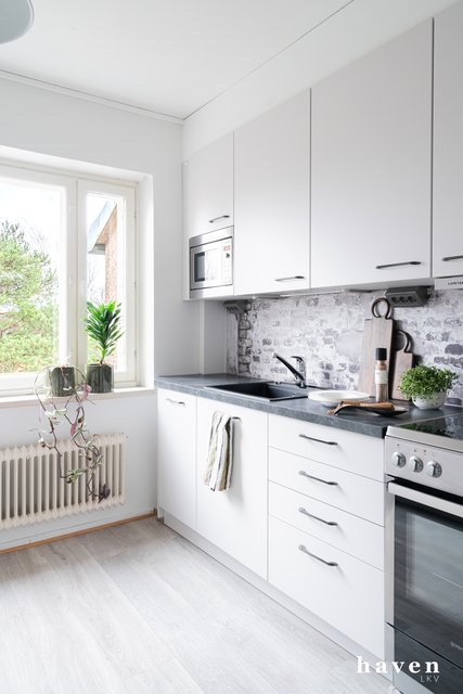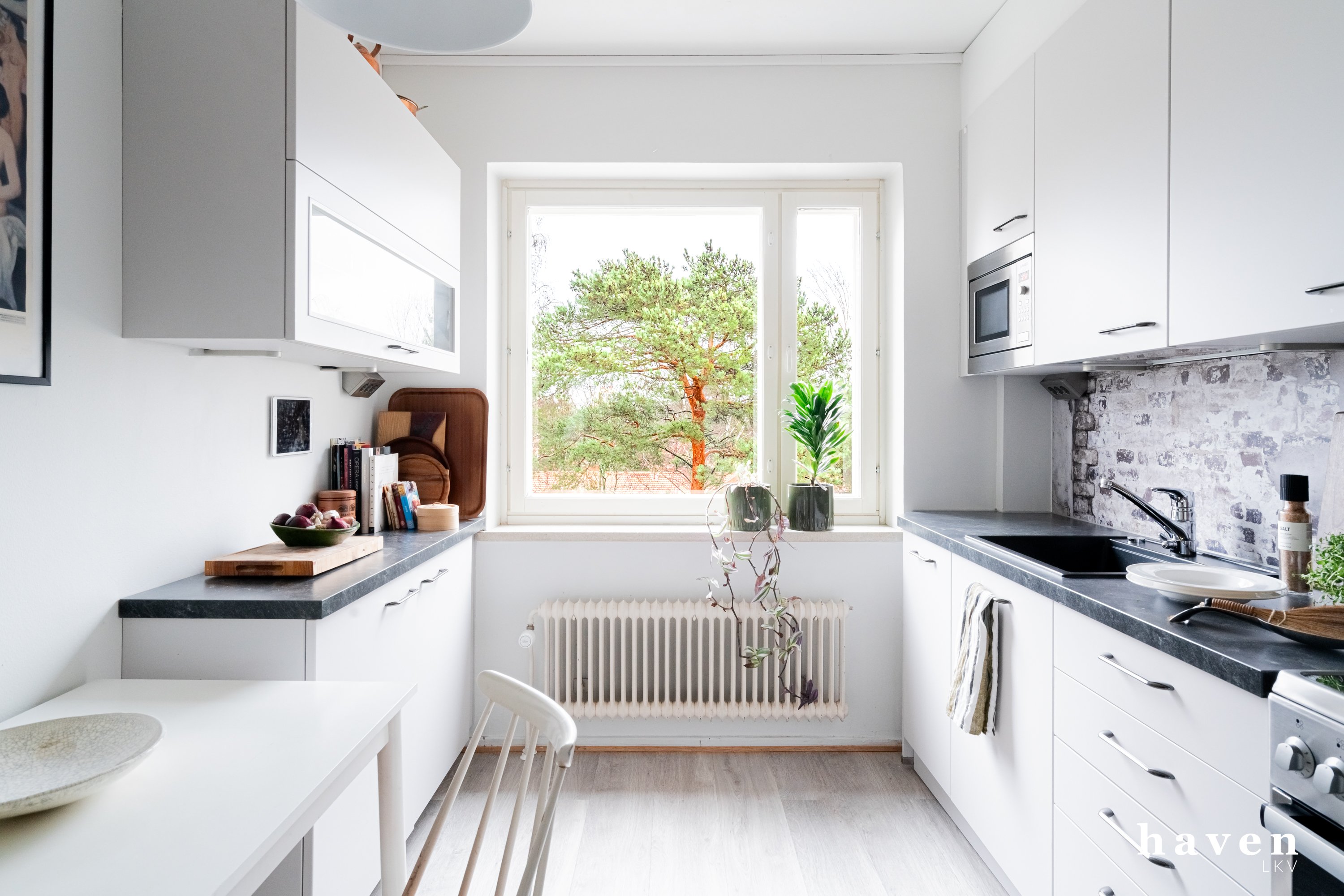 - Keittiöstä näkymät pihapuiden latvustoon, remontoitu putkiremontin yhteydessä 2018.