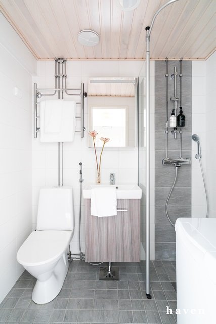 - WC-istuin, suihku, suihkuseinä, pesukoneliitäntä, lattialämmitys, peilikaappi, ja allaskaappi