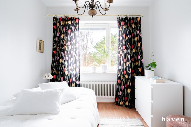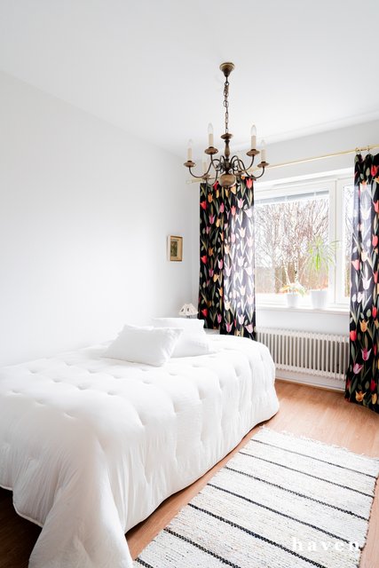 - Tilavasta makuuhuoneesta näkymät pihpuiden latvustoon.
