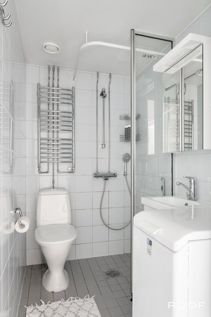 - WC-istuin, suihku, suihkuseinä, pesukoneliitäntä, ja peilikaappi